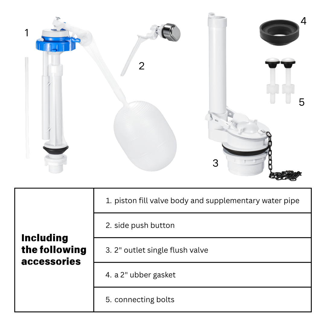 This complete toilet tank repair kit is designed for two-piece toilet maintenance and replacement. It includes a side push button, piston fill valve, 2 inch single flush valve, rubber gasket and connecting bolts, providing a practical all-in-one solution for toilet tank repair.